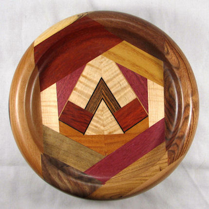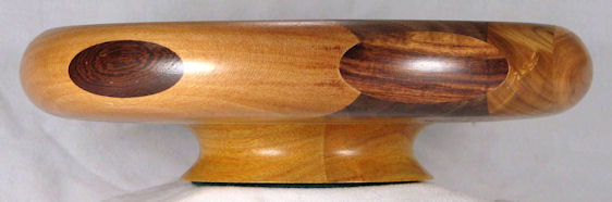 comments: I really like the middle on this one, but I have to say that I'm not as happy with the way the thick piece of padauk in the upper left seems to be not properly balanced, visually, by the walnut and mulberry in the upper right; the upper part of the bowl just has an unbalanced look to me, although only when viewed from above. Fortunately, the striking visual impact of the BOX pretty much makes up for it.