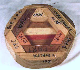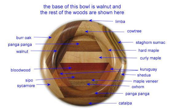 comments: The burr oak in the upper left is highly chatoyant and is very nicely aligned so that it is quartersawn as seen looking directly into the side of the bowl, thus making a very symmetrical pattern with the large ray flakes that are typical of this species. The staghorn sumac in the upper right is outstanding. The cowtree at the top is perfectly quartersawn as seen from the top and has excellent small ray flakes which are common for this species.