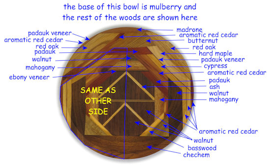 finish: one coat of natural stain then 2 coats of polyurethane (with UV blocker) then 8 thin coats of dewaxed shellac topped by 2 coats of clear flat enamel to take the shine off. Note that this enamel finish sometimes (including this bowl) has a weird effect on the pics without having a similar effect on the actual bowl. What happens is that the yellow woods become noticeably more yellow (again, in the pics, not on the bowl itself) and white woods take on a yellow tint. If I color-correct the white/yellow, then the reds and purples come out very wrong, so I leave the pics the way they are, but be aware that yellows in particular are slightly more yellow in the pics than in reality.