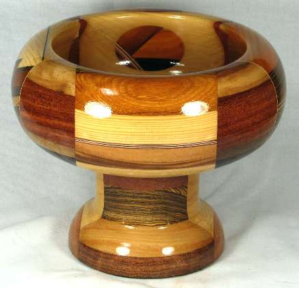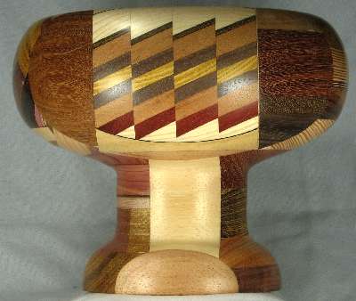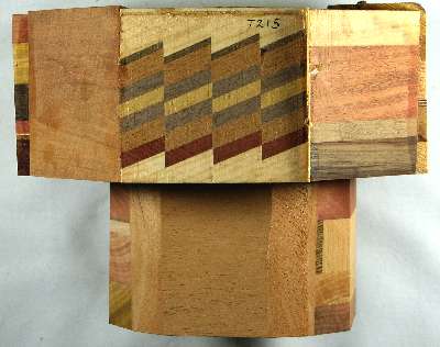 comments: Lots of excellent wood in this one and an overall set of laminations which, which likely to seem a little "busy" to some, give what I feel is an exceptionally pleasing effect. I particularly love the lamination in view 7. The billy webb wood in view 6 and 8 is chatoyant, as is the machiche in views 2 and 4. The orange-colored osage orange in view 3 is a real standout. To me, it's really neat the way the back sides of the view 7 and view 1 laminations show through from the inside in little ovals.