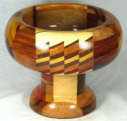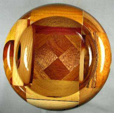 view 7: an elaborate lamination. Along the left from the top down is osage orange, paela, redheart, ash. To the right of the redheart is zircote and below that is a lamination of mahogany veneer and maple veneer. Along the right from the top is a little wedge of mahogany, canary, panga panga, makore, and then a little section of lamination of mahogany veneer and maple veneer. To the left of the canary is paela and to the left of the zircote is chechem and to the left of that is a long slant of lamination of mahogany veneer and maple veneer. Below it all is padauk veneer over obeche over ? and behind it all is pine, aromatic red cedar