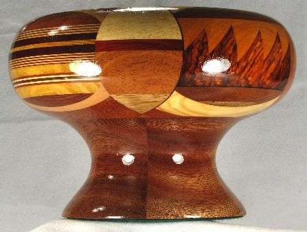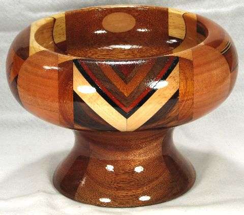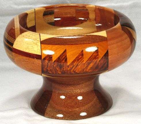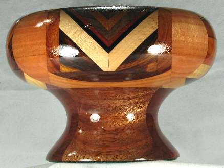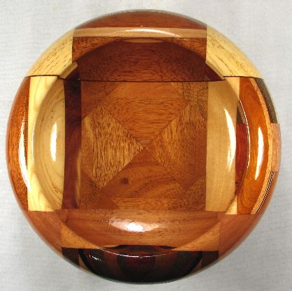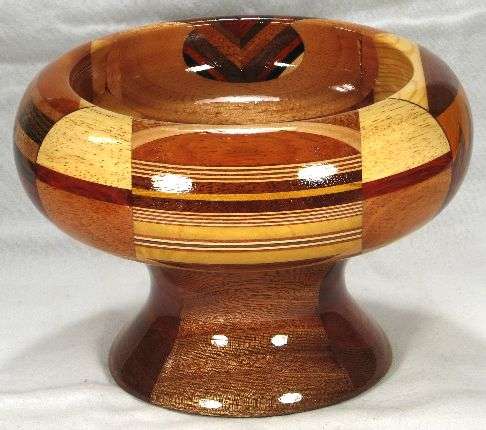 comments: This is a slightly "busy" one, but I think all the complex laminations around the rim work well and make for an attractive look. This bowl sat around for a while before the UV blocker was applied and some of the woods have darkened just a hair from what you see in the pics.