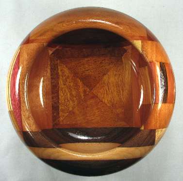 flaws/issues: several of the wood have faded or darkened with time including the jagged area in view 1b, where the redheart on each side of the jagged area has faded on dark tan and the paela middle pieces of the jagged area have all faded to a similar dark tan, so the jaggedness no longer stand out at all. The bright yellow osage orange in the bottom middle of view 3b had darkened to a dull golden brown. Because of all this, plus the fact that on reflection, I just don't love this bowl, I've reduced the price from $125 to $75.