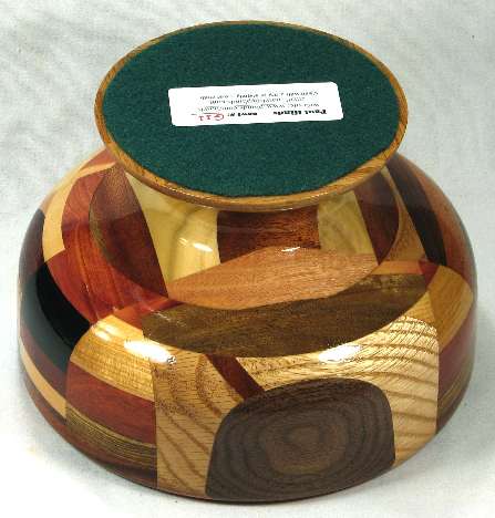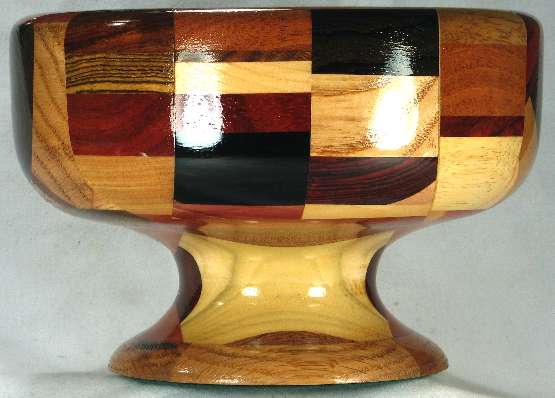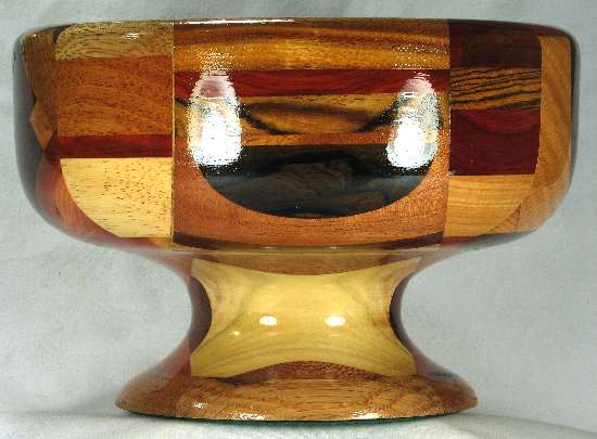 comments: The piece of bubinga from which the bubinga in view 1 was taken had numerous flaws so I had to cut out good sections and I'm very pleased with how I was able to make use of them in this bowl.