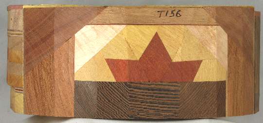 view 1: burst of redheart inside yellowheart all over wenge and backed by white oak then wenge. Above the yellowheart are wedges of curly maple. Above all that is white oak over padak veneer. On both sides are santos mahognay over macawood. The whole section is backed by chenchen veneer.