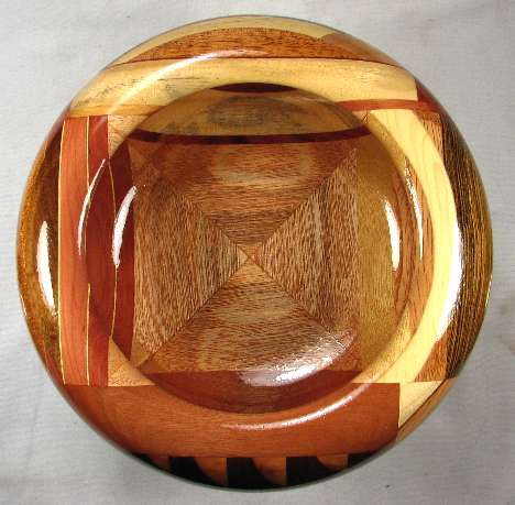 view 5: from the top: mahogany, obeche, bubinga, padauk, canary, obeche. On the left is (top portion from the middle outwards) mahogany veneer, maple veneer, mahogany veneer, maple veneer, aromatic red cedar, wenge, sapele and below that, from the middle outwards, is redheart, osage orange, a tiny sliver of redheart. On the right, from the middle outward, is aromatic red cedar, maple veneer, buginga veneer, maple veneer, aromatic red cedar, sipo, sapele. Behind all of that is bubinga veneer, prima vera with blue stain. To the left and right are wedges of padauk and then under everything is aromatic red cedar and behind everything is aromatic red cedar.