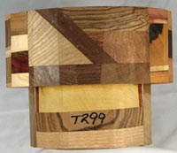 view 8: complex lamination wedge, top to bottom: billy webb wood, bocote behind pine, wenge, cocobolo backed by holly veneer, purpleheart, then a couple of tiny wedges of ? and ?