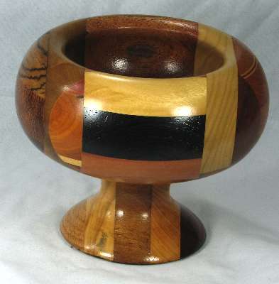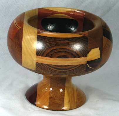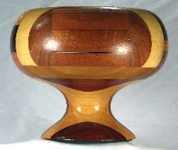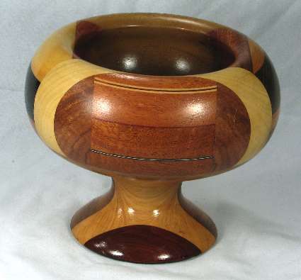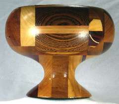 comments: If you look at the views at the bottom of the page of the bowl blank, you'll see that in view 5 the base has a nice lamination in the middle of the redheart but as you can also see, it got totally turned off in the final bowl. I hated to lose it, but I had to in order to get the bowl to the shape I wanted. Sometimes the wood wins, sometimes the shape wins. Similarly, in view 1 of the base, the zebrawood (that has the temporary ID #299 on it) has been completely turned off in the final bowl.