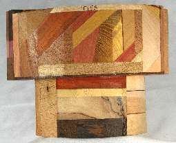 view 1: complex lamination in front of birch, thick walnut veneer, aromatic red cedar. To the left of the birch is a small wedge of afrormosia above an even smaller wedge of mahogany. The complex lamination is, left to right across the top, padauk (orange colored, not red), redheart, osage orange, a tiny arc of padauk, osage orange. The bottom pieces are sipo on the left and redheart in the middle