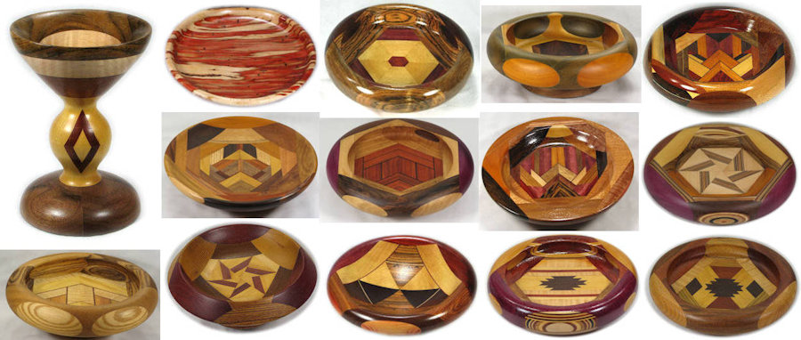 Although I recognize full well the problems inherent in using mixed woods, as explain above, I mix woods anyway because I want my selection process to be based primarily on how the wood LOOKS (that is, color and grain), not on its technical characteristics. I get away with this pretty well because the sections of wood in the bowls are so small that stress fractures are rare. On rare occasions, I am able to feel a slight change in the surface of a bowl that has a hard wood next to a soft wood, but this is while it's on the lathe and moving rapidly from one section to another. With the bowl off the lathe, these changes are not noticible. In any case, I am careful to point out any flaws that you will see or feel, because I don't want you to have any unpleasant surprizes.