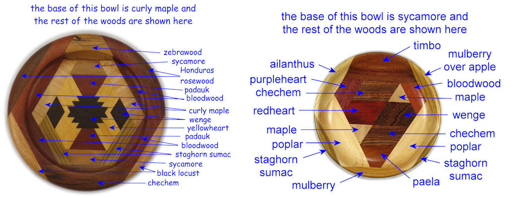 I maintain a web site for information about exotic wood, and to obtain woods for that site, I buy a large variety of wood from many different sources, sometimes even mixed lots that contain some woods I cannot identify. Even for the woods for which I know the identities (or perhaps I should say for which I ONCE KNEW the identities), once they have been photographed for the web site and then cut into sections for use in the bowls I often neglect to note what woods go into a particular bowl, and once the only thing that shows is a small section of wood in a bowl, it can be difficult-to-impossible to identify the wood. SO ... it is quite possible that the identification of woods in a particular bowl will be incomplete.