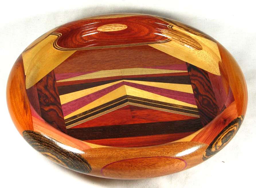 comments: ALL of the wood in this one is really nice but the bocote on the outer rim of views 1 and 8 has a particularly attractive grain contrast (unless of course you don't like it, in which case you might see it as particularly ugly) and the cocobolo in views 3 and 7 is outstanding. There are several chatoyant pieces including the paela in views 3 and 7, both the oak and the bloodwood in view 5 and the mahogany in view 1. This bowl does a particularly nice job of showing off a lot of exotic woods.