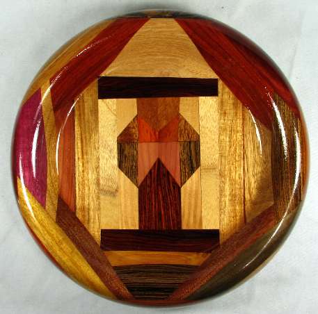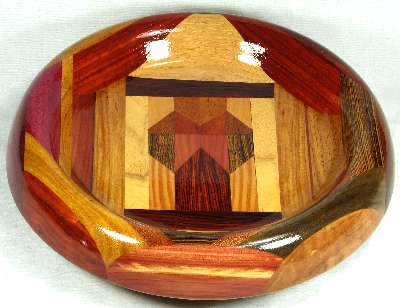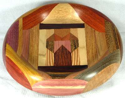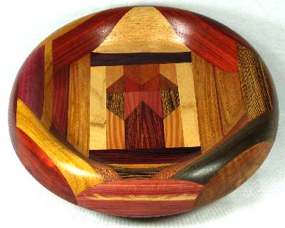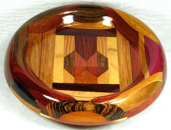 comments: The shape of this one is, to my mind, just outstanding. The graceful curve of the rim is complemented nicely by the corresponding undercut from the bottom, all of which combines to give the laminated wood a wonderful curvature. LOTS of excellent wood in this on and the bocote at the top is particularly good both in grain pattern and in the way the shape turned out: the choice of paele to go in front of it works beautifully.