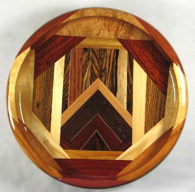 BOX: bottom triangle (flat cut) and corner wedges (quartersawn) are all cocobolo; cocobolo wedge is topped by holly veneer, then quartersawn cocobolo, holly veneer, quartersawn wenge, sycamore(?). The upper portion, left to right: bocote, holly veneer, bubinga, bocote, holly veneer, bocote, [middle], bocote, holly veneer, bocote, cocobolo with sapwood, bocote