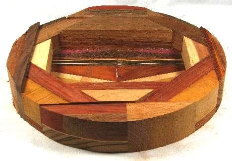 view 1: redheart over maple veneer over ? (grainy brown), over ? (orange --- probably paela), all backed by bocote (showing sapwood on the bottom), aromatice red cedar, canary (with a wide streak in the middle of it that looks a little like walnut), BOX. On the left and rigth of view 1 are small wedges of ? (purplish brown)