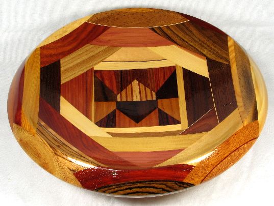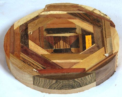 BOX: upper middle is a lamination of thick mahogany veneer and thins. Middle thins are ash, outer ones are oak and the middle two each are cherry. This lamination is sided by very dark pieces of American black walnut. The upper sections are tzalam(?) sided by bubinga. The lower middle is zircote(?) sided by narra and below that is ? sided by cocobolo.