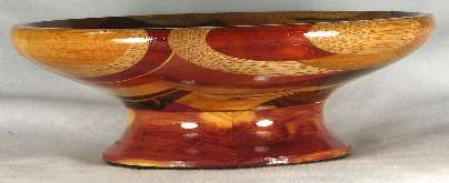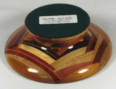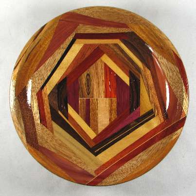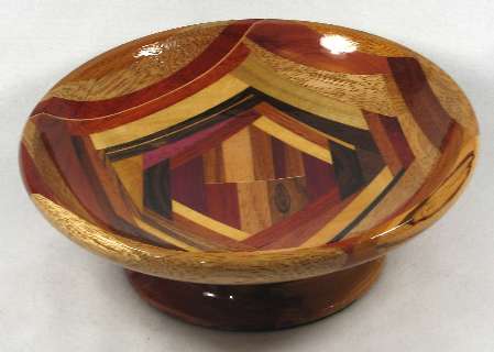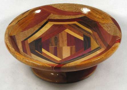 comments: This one was a REAL pain to make because of the odd angles used and the wedge shaped pieces. Every time I added a new piece (and notice how a great many of them are wedges, not parallel-edge pieces as in most of the bowls) it was a pain to clamp it. The odd angles and the wedges and the multitude of small segments produced a very busy look, which I kind of like but I don't think I'll do another one of these --- too much effort in gluing the pieces together.