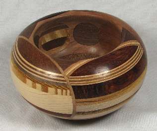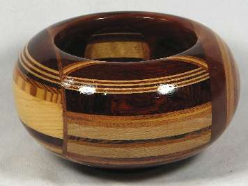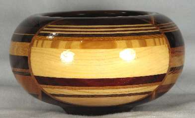 NOTE ABOUT CHANGE IN FINISH This bowl developed a small stress separation in one of the laminations near the bottom and in the process of repairing this, I redid the finish in LOW-gloss polyurethane so that the bowl now has the "look" shown in the rightmost image at the very bottom of the page rather than the "shiny, wet" look shown in the other pics on this page. Also, there is now a crack in the meranti of the base, but it does not detract from the beauty of the bowl and to even see it you have to hold the bowl upside down or look directly into the opening from the top.