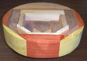 BOX: middle is narra over walnut, then the thin separation on both sides, then walnut over mahogany, then American red elm. Above the narra is an ash thin, then walnut, then padauk veneer, then walnut.