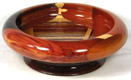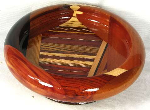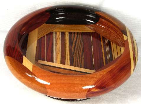 BOX: lower left corner is red oak, lower right corner is (from corner) hard maple, walnut, hard maple, African mahogany. On the right at a slight slant, from the inside, flake maple, macassar ebony thin, mahogany, and a tiny wedge of padauk. From the bottom up, walnut, cocobolo, hard maple veneer, cocobolo, hard maple veneer, thick mahogany veneer, hard maple veneer, thick mahogany veneer, hard maple veneer, mahogany veneer, oak, mahogany veneer, maple veneer, walnut, maple veneer, mahogany veneer, oak, ? (grainy brown wood), bocote, cocobolo, hard maple veneer, cocobolo, and then the yellow thin of view 5