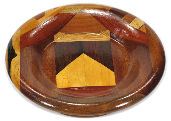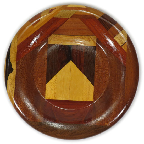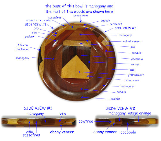 COMMENTS: VERY nice pleasant curved shape to this one. The mahogany on both sides of the middle is nicely chatoyant as is the base, and the wood is excellent throughout the bowl.