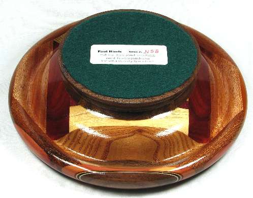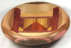 comments: VERY pleasant curve shape on this bowl and excellent wood throughout, especially in the box but also the chechem in view 5 and the chatoyant mahogany in views 3 and 7. The grain arrangement of the elm in view 1 came out amazingly well, even to the point of having an internal omega curve as you can see in the first pic below.