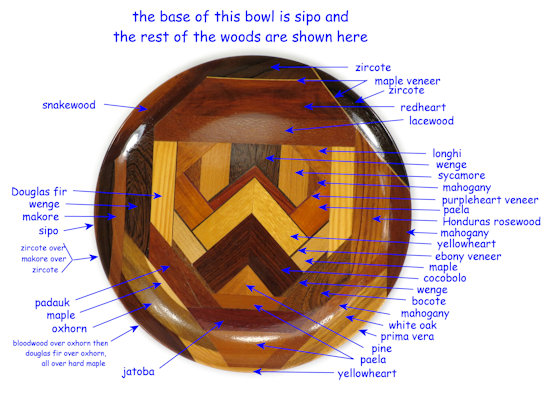 COMMENTS: The zircote in the upper right was a real standout when the wood was raw and in fact dictated the shape of the bowl because I just HAD to do a vertical side to keep the full effect of the ray flakes on this piece. Unfortunately, they do not show up nearly as well now that the polyurethane has been applied. I'm pleased with the overall pattern of this bowl, especially the design and the boldly contrasting colors in the middle. The wenge on the inner left side looks great and the redheart at the top is also particularly nice.