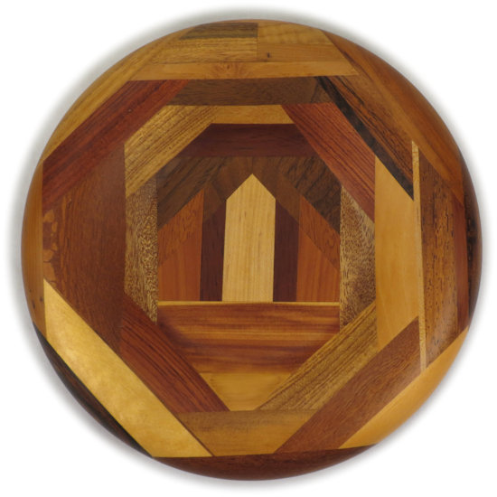 finish: one application of natural stain then 3 coats of high gloss spar polyurethane (with UV blocker) topped by 2 coats of clear flat enamel to take the shine off. Note that this enamel finish sometimes (including this bowl) has a weird effect on the pics without having a similar effect on the actual bowl. What happens is that the yellow woods become noticeably more yellow (again, in the pics, not on the bowl itself) and white woods take on a yellow tint. If I color-correct the white/yellow, then the reds and purples come out very wrong, so I leave the pics the way they are, but be aware that yellows in particular are slightly more yellow in the pics than in reality.