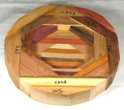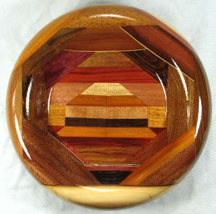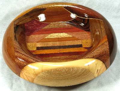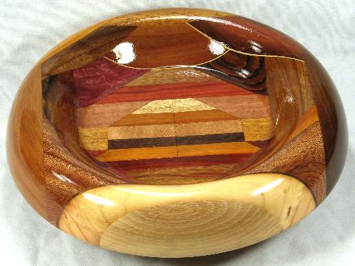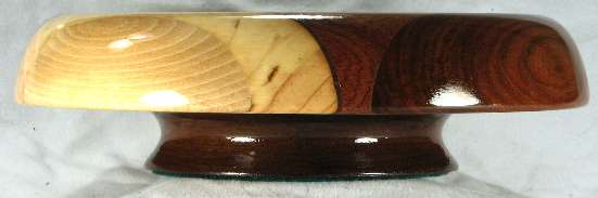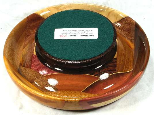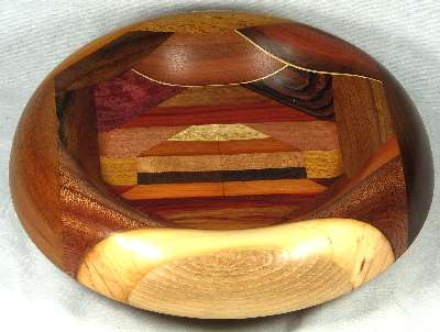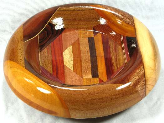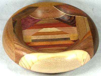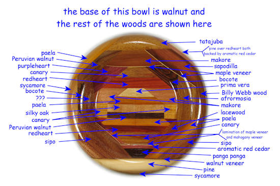 I ALWAYS POINT OUT ANYTHING THAT NEEDS TO BE COMMENTED ON. THESE ARE (UNLESS OTHERWISE STATED) THINGS THAT DO NOT DETRACT FROM THE BEAUTY OF THE BOWL, BUT I WANT TO BE SURE I GIVE A COMPLETE DESCRIPTION. SO ... The sapodilla in the upper right had a beautiful "medium-rare-steak" look (brown on the outsides, pink in the middle) that you can see in the upper right corner of the view 1c pic below, but the inner pink has darkened to brown since the pic was taken. On the right side of the pine at the bottom, there is a dark streak (probably from a minor gum inclusion) which you can see clearly. I would prefer that it not be there even though it is minor. Also just to the right of that there is a very small void in the thick walnut veneer that you can only see if you catch the light just right. There has been some minor color fading/darkening since these pics were taken some years ago but nothing major and the video (done more recently) shows the colors exactly as they are now.