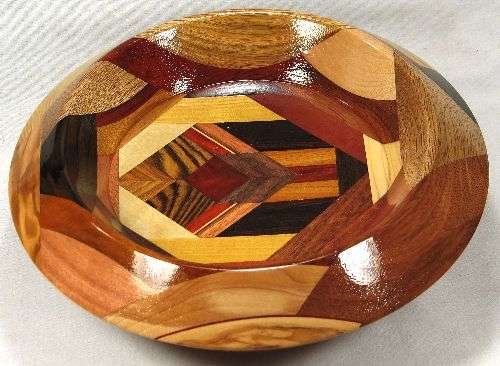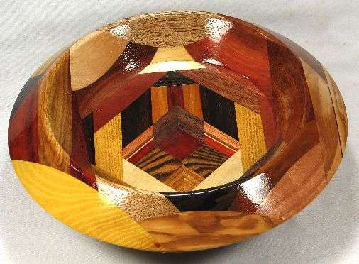 view 3: redheart, canary, padauk (on the bottom of the bowl this is prima vera), dark cocobolo, BOX