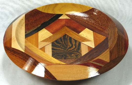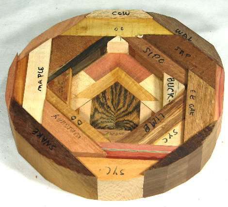 BOX: middle is bocote sided by maple sided by snakewood. Above that is padauk veneer then canarywood slants ending in ?(light wood --- could be maple but I don't think so), then above that is redheart slants ending in prima vera.