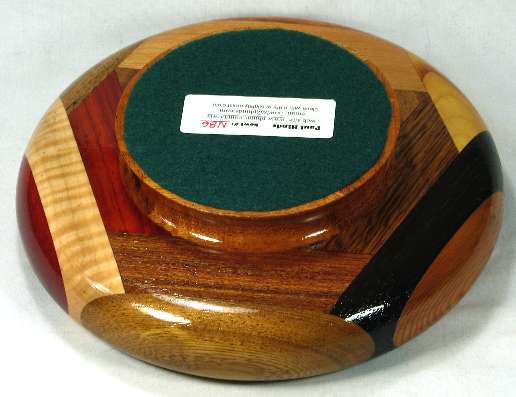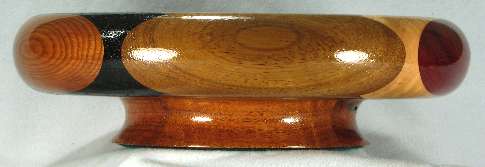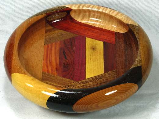 comments: the macawood in view 1 is nicely chatoyant and the yew/wenge combination in view 4 looks terrific, as does the bloodwood/maple combination in view 6. There are fewer types of wood in this bowl than is typical for my bowls, but they are all great with the single exception of the bocote in view 8 which is not bad in any way, just not at all a standout for the species.