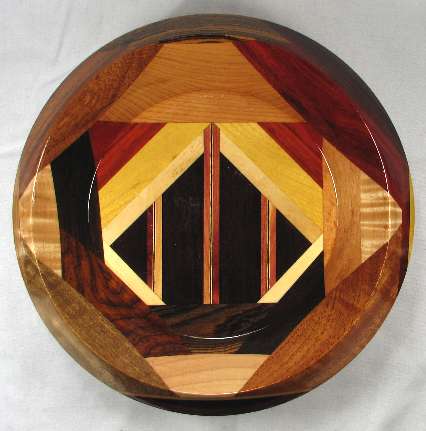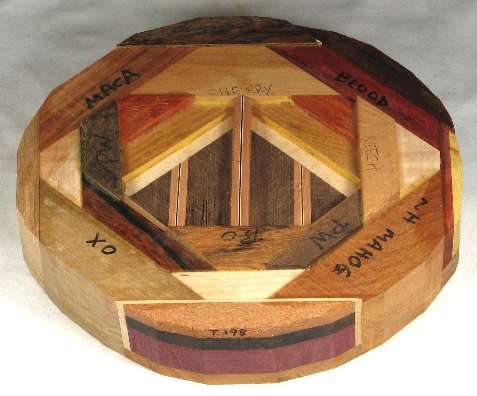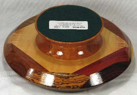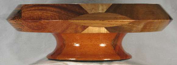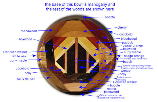 comments: The bloodwood in the upper right has outstandingly deep blood red color, the bocote at the top is excellent, the padauk wedges in the upper left and upper right are a terrific orange color. The base on this one is thicker (up/down) than in most of my bowls.