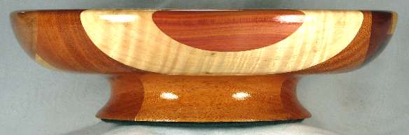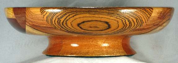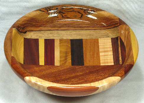 comments: The construction technique on this one is different than most of my bowls in that the vertical section in the center (with all the woods running horizontally in the orientation view) was done up first and then the sides were added to that, allowing room for large chunks (Honduras mahogany in view 3 and Honduras rosewood in view 7) that I think look really good.