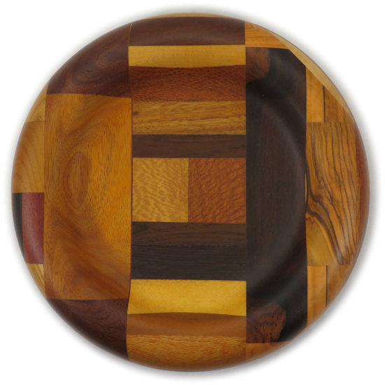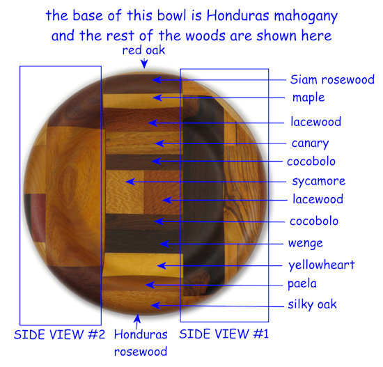 COMMENTS: Very nice overall curvature --- a case where the undercut rim gives, as it so often does, a very pleasing result. In the big piece of cocobolo in on the right side what looks like it is probably sapwood at each end is actually not. This is one of those pieces of cocobolo that has two radically different colors, one very dark and the other much lighter, right next to each other. Most of the lighter part got turned off but you can see it clearly in the bowl blank image below. The olive on the right side is particularly nice as is the paela on the left side.