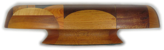 I ALWAYS POINT OUT ANYTHING THAT NEEDS TO BE COMMENTED ON. THESE ARE (UNLESS OTHERWISE STATED) THINGS THAT DO NOT DETRACT FROM THE BEAUTY OF THE BOWL, BUT I WANT TO BE SURE I GIVE A COMPLETE DESCRIPTION. SO ... The curly maple on the left rim has picked up a small amount of colored dust in the areas where the interlocked grain is pointing mostly outward, and this has given them an unnatural dark-stripe effect. There is a small stress separation at the bottom of the middle where the wenge meets the cocobolo. You can see it if you catch the light just right but most of the time it's invisible. None-the-less I've reduce the price a bit because of it from $150 to $125.
