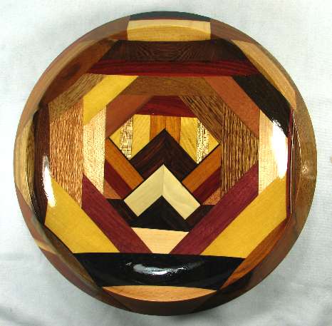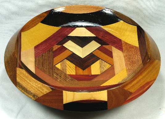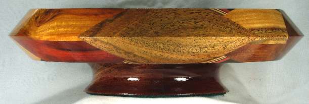 view 5: pine over cocobolo over wenge over cowtree over ebony veneer over yellowheart, all backed by panga panga then padauk, ipe, padauk, BOX. On the left and right are wedges of billy webb wood