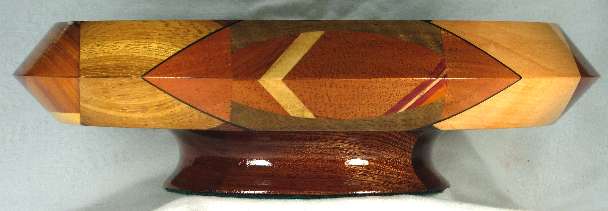 view 8: on the left and right are wedges of mahogany; in the center are two pieces of mahogany split by tulip poplar and off at the right edge of that section is a little lamination of aromatic red cedar thin, bubinga veneer, ash thin, bubinga veneer, aromatice red cedar, and then a tiny wedge of paela. All of that backed by oxhorn and then ebony veneer, osage orange, machiche, BOX