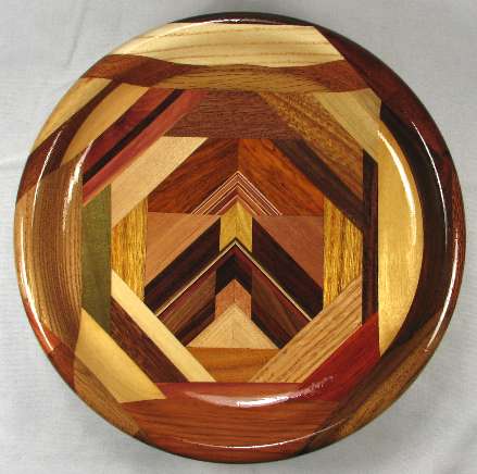 BOX: bottom up; beech, sycamore sided by cocobolo, cocobolo sided by ?(dark brown wood), aromatic red cedar thin, ebony veneer, holly veneer, maple veneer, thick walnut veneer, osage orange sided by cocobolo with makore above the cocobolo, aromatic red cedar thin, maple veneer, padauk veneer, aromatic red cedar thin, maple veneer, mahogany veneer, maple veneer, aromatic red cedar thin, holly veneer, mahogany veneer, maple veneer, cocobolo