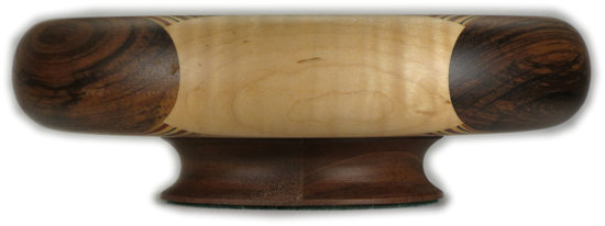 I ALWAYS POINT OUT ANYTHING THAT NEEDS TO BE COMMENTED ON. THESE ARE (UNLESS OTHERWISE STATED) THINGS THAT DO NOT DETRACT FROM THE BEAUTY OF THE BOWL, BUT I WANT TO BE SURE I GIVE A COMPLETE DESCRIPTION. SO ... there is a small void in the piece of bocote at the right of center. This is the kind of thing that happens with wood, it being an organic material, and I don't consider it significant but since you might not agree I want to be sure you are aware of it. You can see it easily in the enlargement of the orientation view
