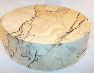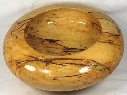 NOTE: as you can see from the bowl blank below, this wood is natually near-white and the application of the natural stain and polyurethane causes a strong shift to yellow. This is unavoidable with maple, although it is my understanding that there is at least one special finish that has a greatly reduced yellow shift. I don't work with solid woods much and have not explored that option. I find both the original white and the final yellowish tan attractive so while I do not like to cause significant shifts in the color of wood this one just has to be an exception.