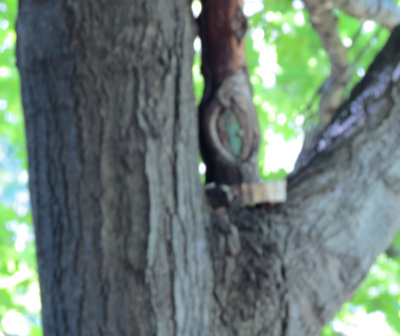 either painted onto a healed cut in the side of a tree, or attached to the side of the tree.