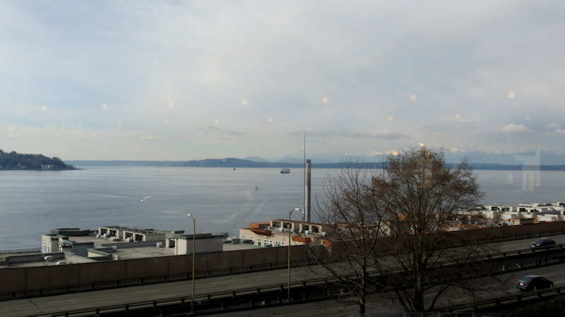 Puget Sound (may have a more localized name in that area) with the Northern tip of West Seattle on the left and Bainbridge Island in the middle distance and the Olympic Mountains WAY off the in middle distance.